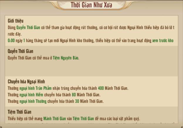 Trước đây có một số Huynh Tỷ do nhiều lý do mà bỏ lỡ các ngoại trang yêu thích, điều đó dẫn đến cảm thấy tiếc nuối. Để bù đắp cho những bỏ lỡ này, các Huynh Tỷ có thể đến NPC Thời Như Tích tại Lạc Dương, sử dụng Quyển Thời Gian để tham gia quay thưởng, có cơ hội nhận lại các ngoại hình quý hiếm như Thời Trang, Thú Cưỡi, Thần Khí Ảo Hóa, Ngoại Hình Trân Thú, Khung Avatar, Khung Chat…